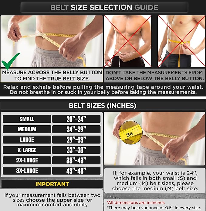 - DO NOT TRUST YOUR PANT SIZE – S (20”-24”), M (24”-29”), L (29”-33”), XL (33”-38”), 2XL (38”-43”), 3XL (43”-48”). Please ensure that you measure your size ACCORDING TO THE SIZE CHART AND THE MEASURING INSTRUCTIONS provided in the size chart. Measure around your lower back and across your belly button to find your TRUE BELT SIZE. Measurements taken at pant size would result in WRONG BELT SIZE. If your waist size falls between two sizes, please CHOOSE THE UPPER SIZE for maximum utility.