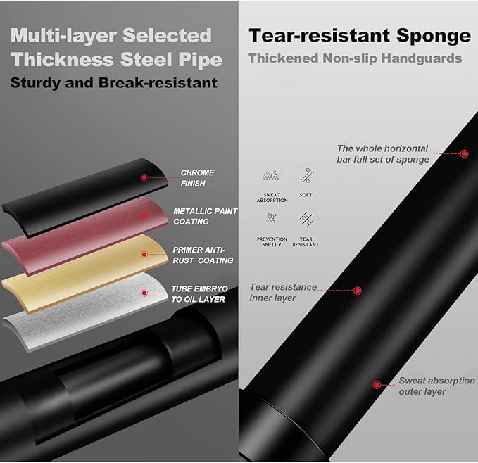 - 【Suitable for Narrow and Wide Grip Training】Full-covered Hand-Grips - The surface of the chin up bar is full covered with high quality EVA foam handle offers additional comfort and minimizes hand fatigue or pain. Effectively avoid calluses and minimize hand fatigue. Provide more choices for hand activity space according to your exercise aim