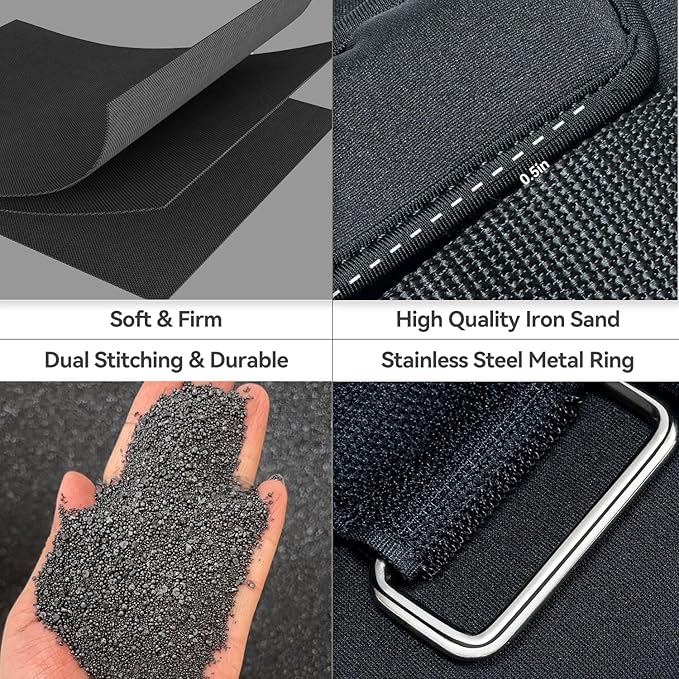 - Premium Materials: The leg weights are made with high-quality fabric for a comfortable and sweat-absorbent workout. The small sandbags inside are double-layered, preventing sand leakage and rust. The stainless steel D-ring is rust-resistant, even with sweat or water exposure. These weights have enhanced stitching and a secure magic-hook closure for durability.