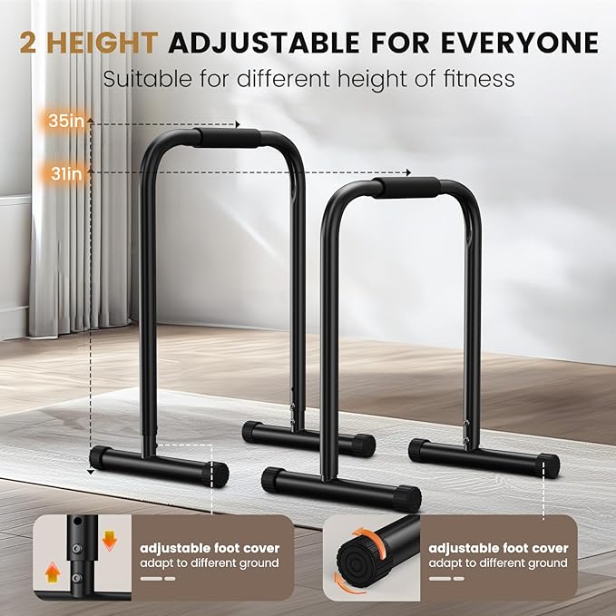 - 【2 HEIGHT ADJUSTABLE】 Adjustable dip bars in the height of 31"-35", free width adjustment unlimited, adapt to different body types and heights. You can choose from a variety of exercises for home gym, like DIPS, INVERTED ROW, PUSH UP, CALISTHENICS