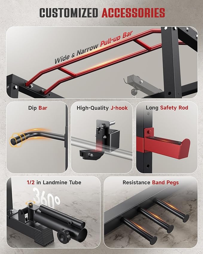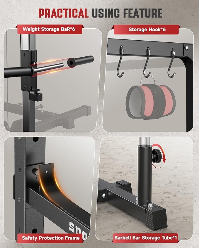 - 【Practical Using Feature】Say goodbye to a cluttered floor. Sportsroyals power rack for home gym is built with 1 barbell bar storage holder, 6 weight storage racks, and 6 handle storage hooks, it can perfectly organize all your gym accessories and weight plates. In addition, the rubber pads on the safety frame and safety rod can provide good cushioning, and ensure the safety of workouts.