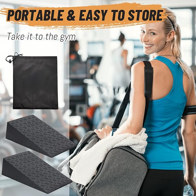 - Portable Squat Wedges with Protective Pouch - Each one have 2 blocks(one pair for each package). The overall dimensions of the rubber wedge is 13’’(L) x 6.7’’(W) x 4’’(H), which is large enough for you to step your entire foot onto the calf stretch wedge. If you need to take the foot wedge for stretching outdoors or to the gym, the included black storage bag can help you store them and also protect your backpack from getting dirty.