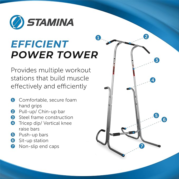 - STAMINA POWER TOWER - Our Power Tower provides a total body workout, suitable for body strengthening, build and tone muscles, and to lose weight. This pull up bar station improves your figure, posture, mobility, balance, and overall fitness health.