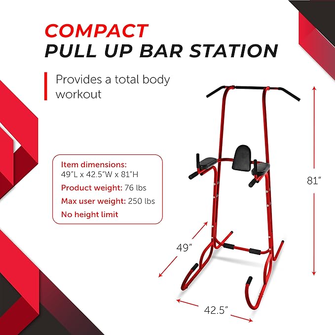 - STABLE AND SPACE SAVING - The durable steel frame of this dip bar tower supports powerful workouts of users up to 250 lbs. Our pull up bar provides multiple workout stations that fit easily in any indoor or garage space.