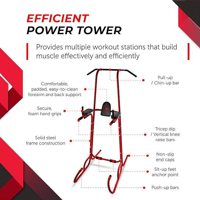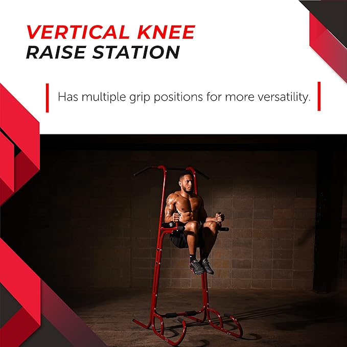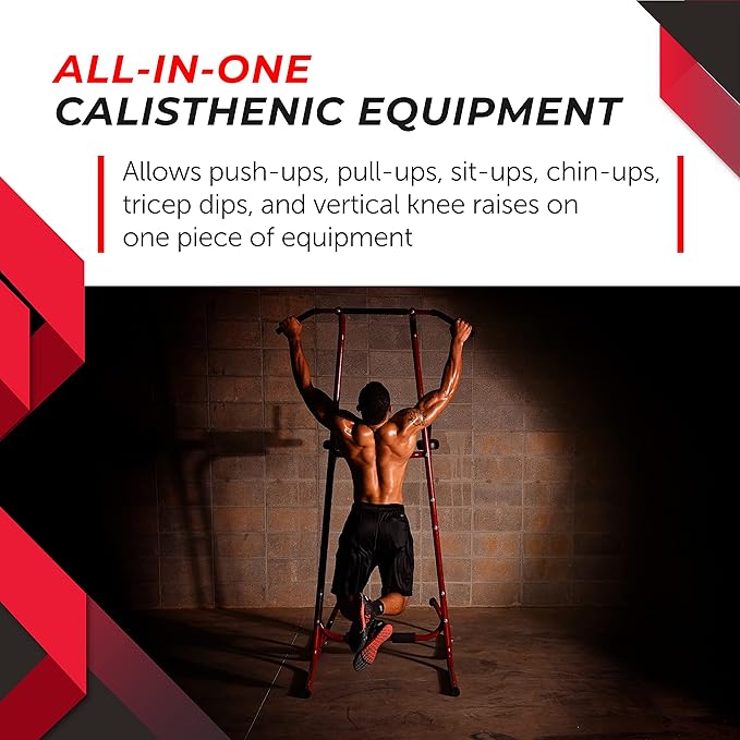 - ALL-IN-ONE CALISTHENIC EQUIPMENT - This versatile dip station offers different workout possibilities. Perform pull-ups, chin-ups, dips, vertical knee raise (VKR), push-ups and sit ups with this power tower.