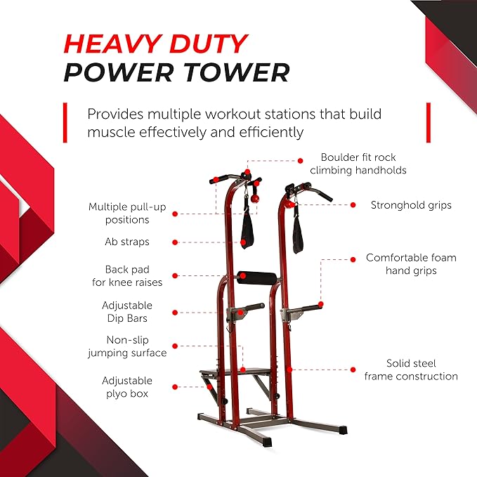 - UNIQUE BOULDER GRIPS - The heavy-duty loops of this power tower keep your back and arms supported during leg and knee raises. This dip station is also equipped with boulder grips that emulate rock-climbing for an increased grip and forearm strength.