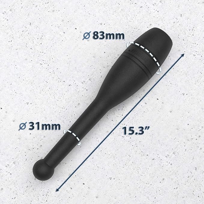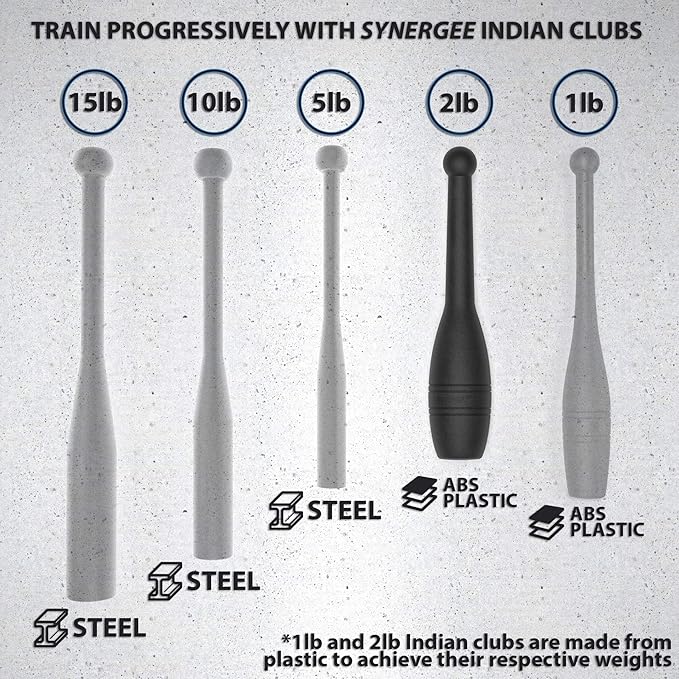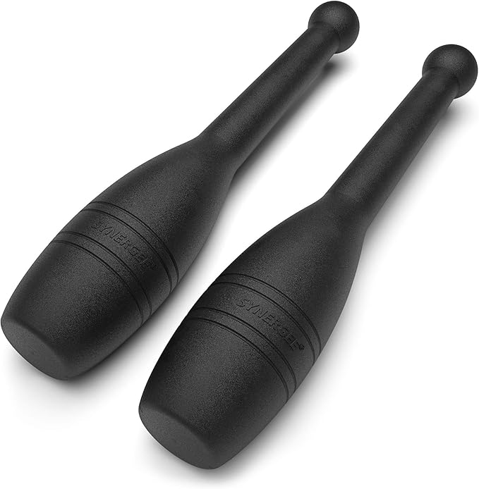 - ★ WHAT’S IN THE PACKAGE ★ – Synergee Indian Clubs are sold in pairs, are made from steel, and finished with a black matte coat. This pair contains (2) 2 lb Indian Clubs, measuring 15.3” long and each has a 31 mm diameter handle and 83 mm at the thickest part of the weighted end.