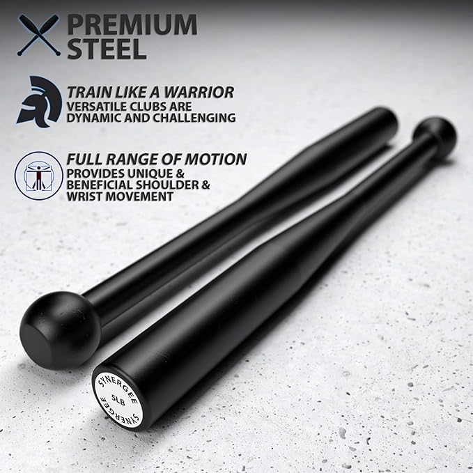 - ★ WHAT’S IN THE PACKAGE ★ – Synergee Indian Clubs are sold in pairs, are made from steel, and finished with a black matte coat. This pair contains (2) 5 lb Indian Clubs, measuring 16.15” long and each has a 20 mm diameter handle and 34 mm weighted end.