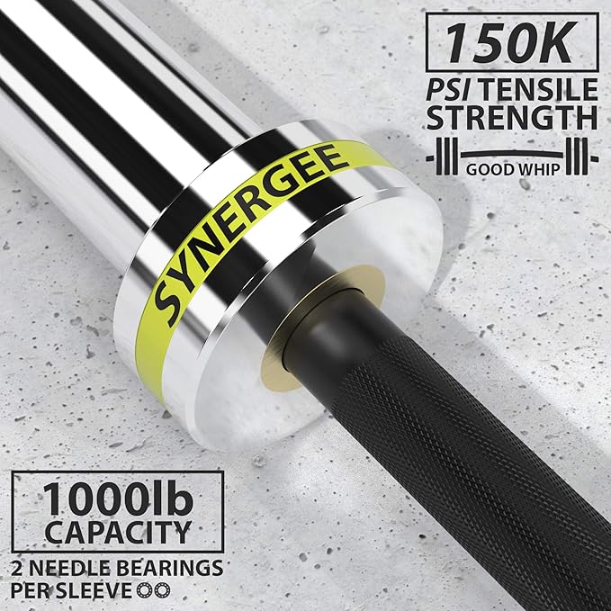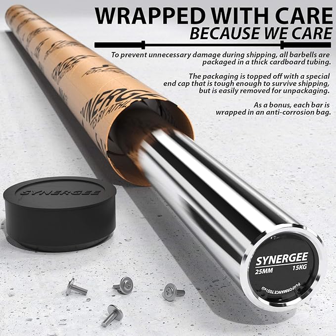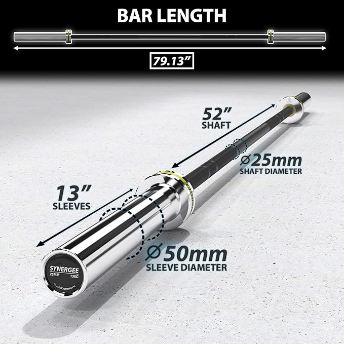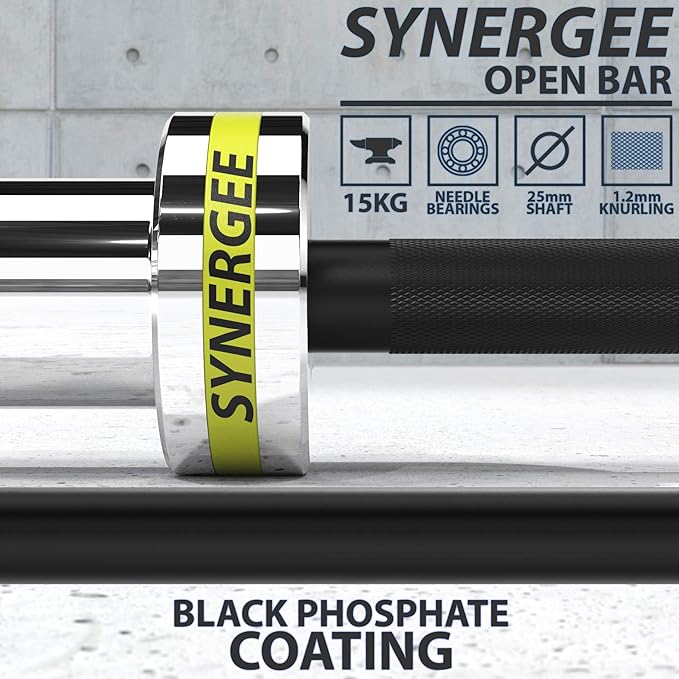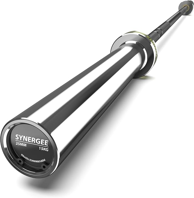 - Each bar has a black phosphate coated shaft and chrome plated sleeves. This bar is 15 KG, 25 mm-diameter (standard women’s) bar and comes fitted with yellow silicon Synergee rings.