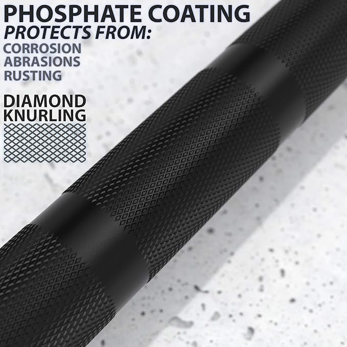 - The Open Barbell is made of high-grade steel, giving it a 150K psi tensile strength rating and a max load of 1000 lbs. It comes with a standard knurl with dual marks to provide grip without the rip. The black phosphate coating on the shaft and chrome on the sleeves protects from oxidation and wear. Each sleeve has a loadable length of 16.4 inches (20 kg) OR 13 inches (15 kg), so you can lift lots!