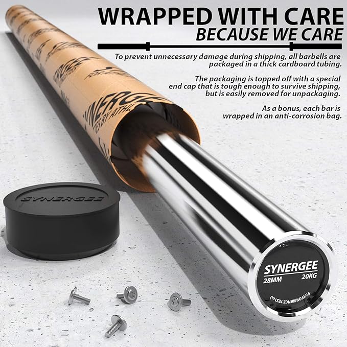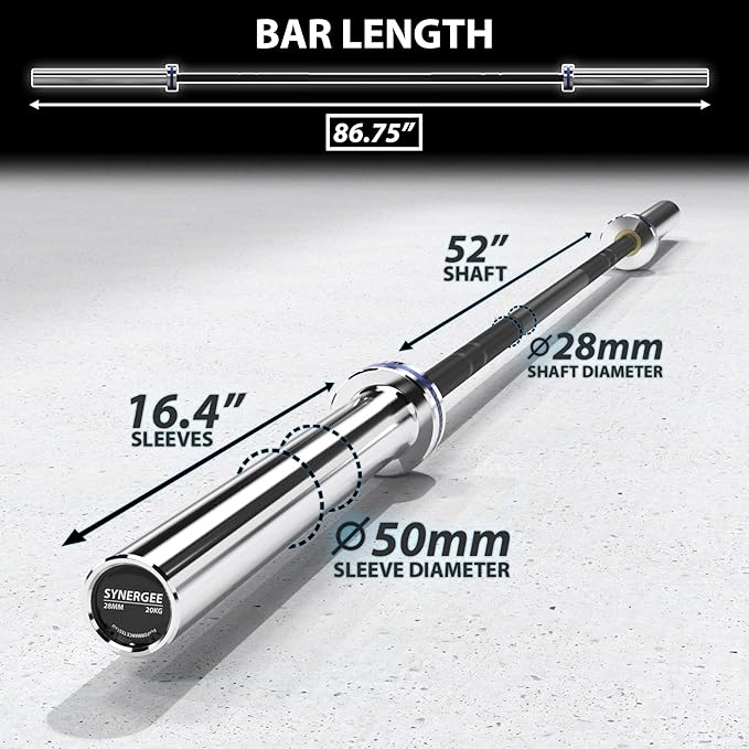 - Each bar has a black phosphate coated shaft and chrome plated sleeves. This bar is 20 KG, 28 mm-diameter (standard men’s bar) and comes fitted blue Synergee silicon rings.