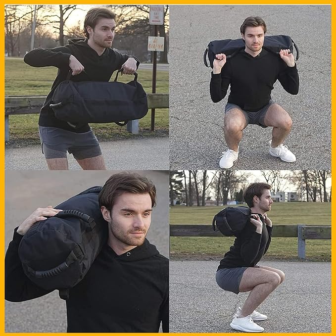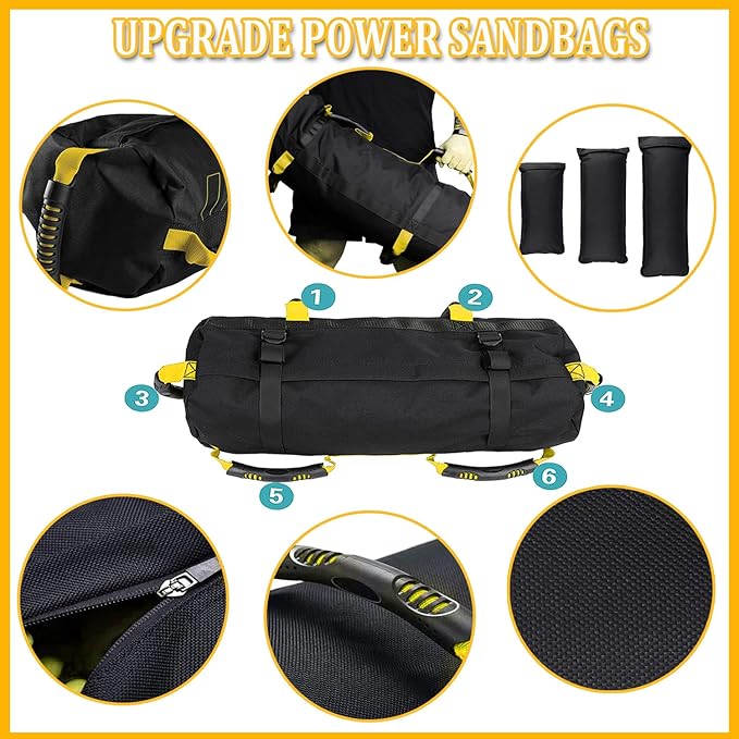 - ⚫Material - The training sandbags are made from premium fabric, the shell is crafted from heavy-duty 1000D Oxford fabric, and the 6 handles are made with multiple stitching for durability and practicality. Each bag comes with 3 padding pieces and a closure to prevent spills and give you the flexibility to use these bags whether you are a beginner or a sandbag instructor.