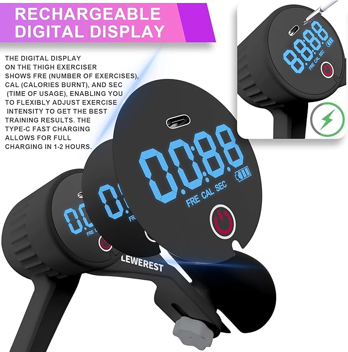 - 【RECHARGEABLE DIGITAL DISPLAY】- The digital display on the inner thigh toner shows FRE (number of exercises), CAL (calories burnt), and SEC (time of usage), enabling you to flexibly adjust exercise intensity to get the best training results. The Type-C fast charging allows for full charging in 1-3 hours.