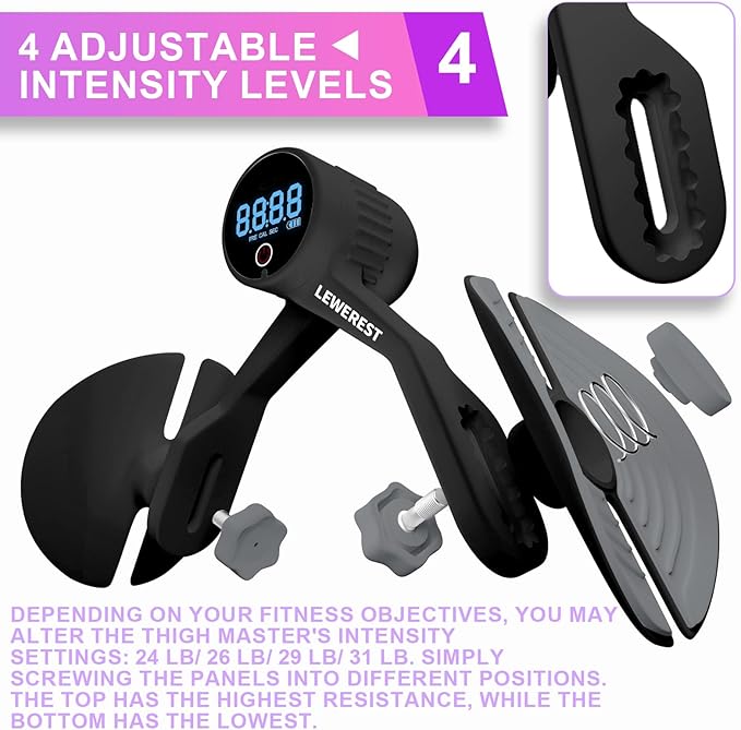 - 【4 ADJUSTABLE INTENSITY LEVELS】- Depending on your fitness objectives, you may alter the tool's intensity settings. The difficulty of workout will increase as the resistance increases. We advise beginners to start with a low resistance level. The 5-level adjustable LEWEREST inner thigh exercise equipment allows for variable resistance simply screwing it into different positions. The top has the highest resistance, while the bottom has the lowest.