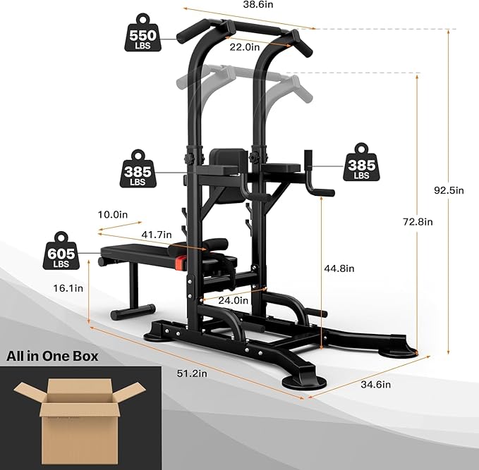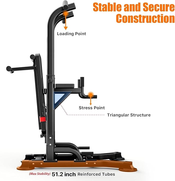 - 【Premium and Comfortable Material】This pull up bar free standing is made of high-quality thickened metal pipes to ensure great stability and long-lasting use. Our pull up tower is filled with soft and high-resilience foam in the weight bench cushion, seat cushion, and 2 elbow cushions that can reduce impact and muscle fatigue during training.