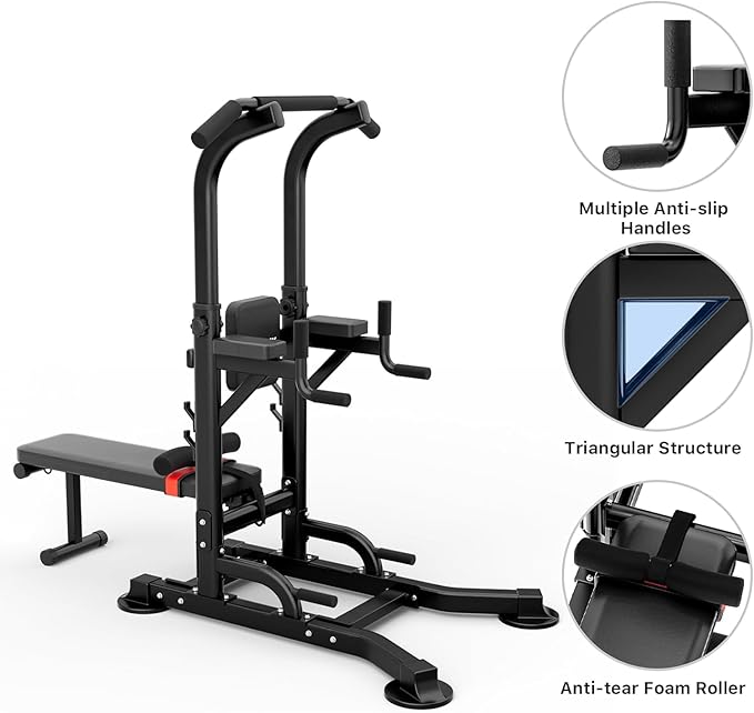 - 【Multifunctional and Space-Saving】The pull up dip station with a detachable weight bench is ideal for various exercises such as pull-ups, vertical knee raises, bench presses, dumbbell rows, push-ups and more. The bench can be fixed by the bolts in a specific position as you need and be folded up easily when not in use to save your floor space.