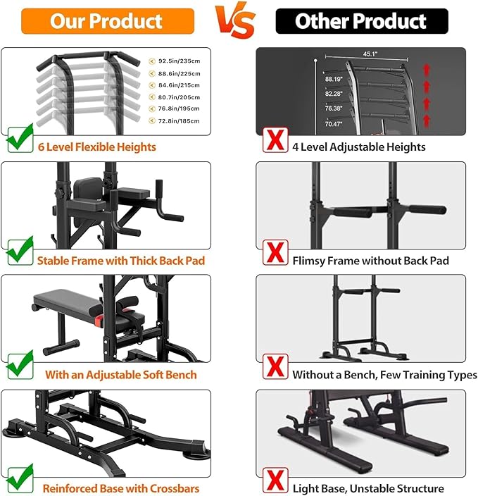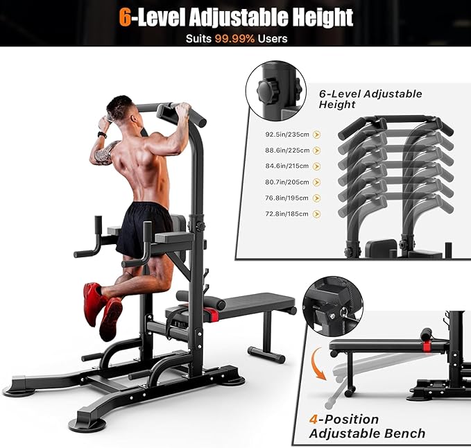 - 【Multi-gear Adjustable Heights & Angles】Our Uboway power tower features 6 adjustable heights from 72.8 inches to 92.5 inches and the weight bench can be adjusted in 4 angles as you need. The unique design makes it suitable for 99.99% of users, perfect to build strength and shape your body.