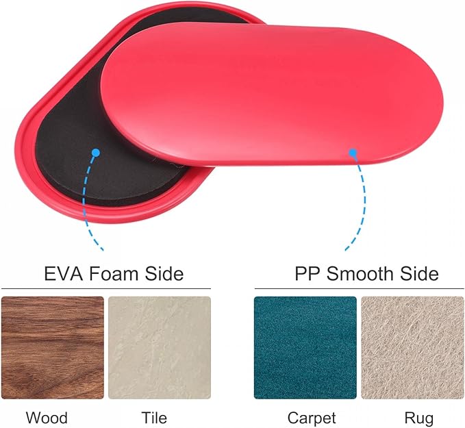 • DOUBLE SIDED DESIGN: The oval glider disc is in dual-sided design which suits workouts on all surfaces. The durable EVA foam side is for hard floors like wood or tiles, and the PP smooth side can be used on fabric floors like carpets or rugs