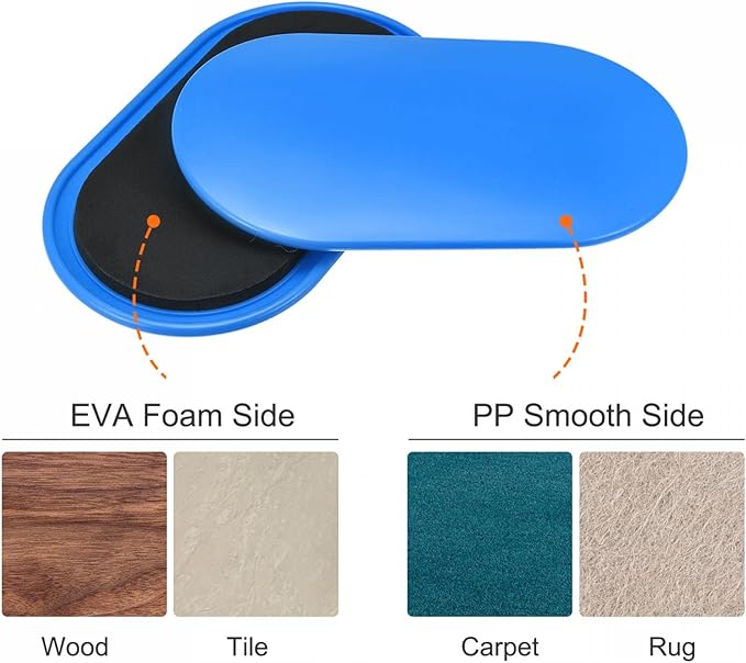 • DOUBLE SIDED DESIGN: The oval glider disc is in dual-sided design which suits workouts on all surfaces. The durable EVA foam side is for hard floors like wood or tiles, and the PP smooth side can be used on fabric floors like carpets or rugs