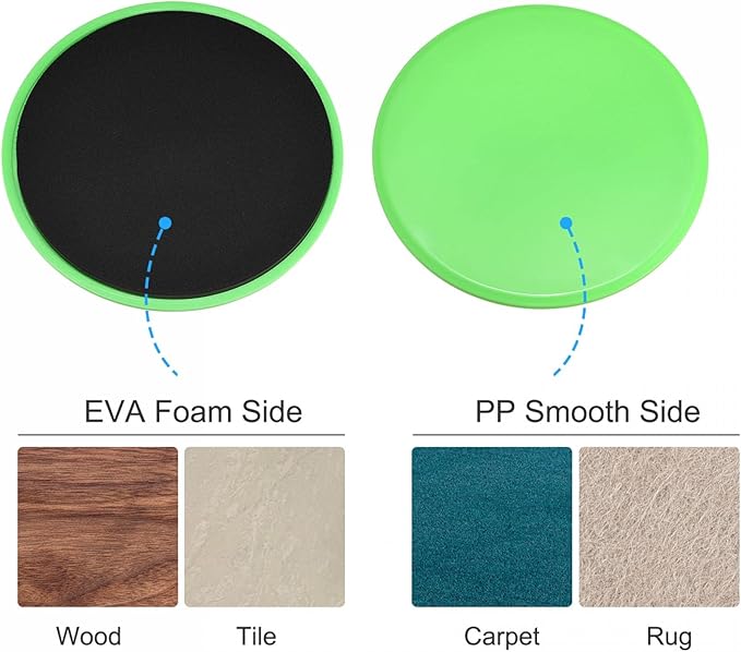 • DOUBLE SIDED DESIGN: The glider disc is in dual-sided design which suits for workout on all surfaces. The durable EVA foam side is for hard floors like wood or tiles, and the PP smooth side can be used on fabric floors like carpets or rugs