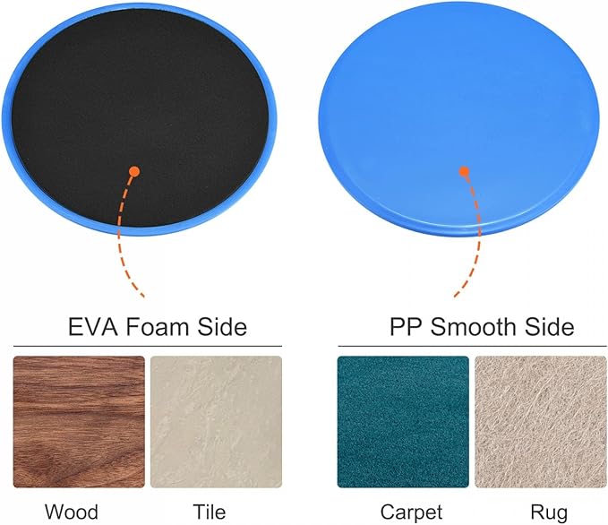 • DOUBLE SIDED DESIGN: The glider disc is in dual-sided design which suits for workout on all surfaces. The durable EVA foam side is for hard floors like wood or tiles, and the PP smooth side can be used on fabric floors like carpets or rugs