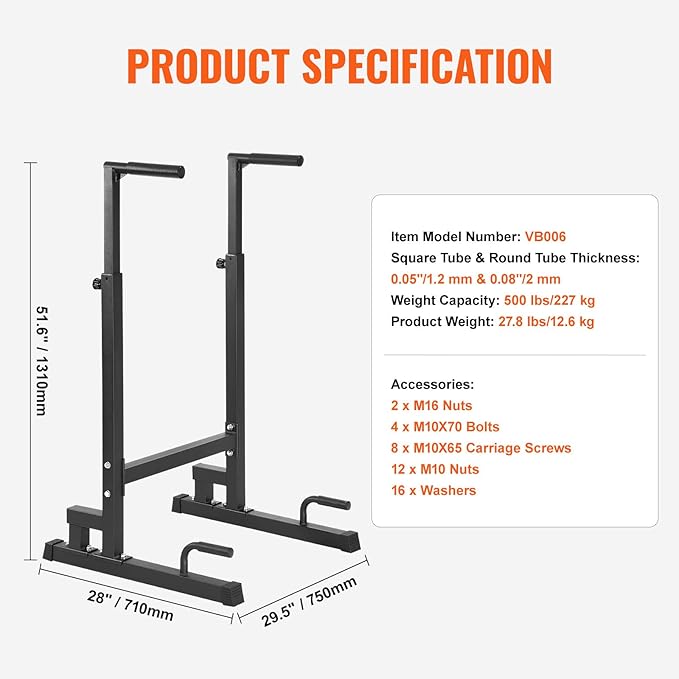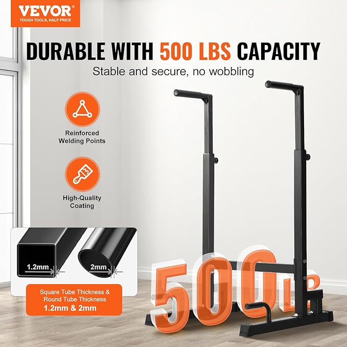 - Sturdy Construction: Our dip bar boasts tough construction, using thickened steel tubes (0.05"/1.2 mm thick square tube & 0.08"/2 mm thick round tube) for rock-solid reliability. It's built to handle up to 500 lbs/227 kg effortlessly, ensuring a stable and safe workout session every time. With its premium coating, it stays vibrant and durable for the long haul.