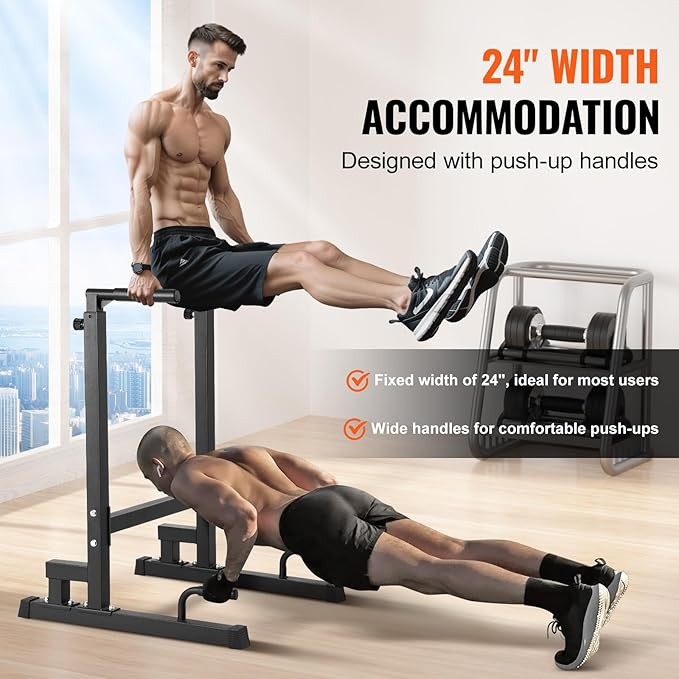 - Just Right Width: With a comfortable 24-inch width, the dip bar station fits most users like a glove. Equipped with handles at the bottom with non-slip sleeves for better grip and comfort, it's a must-have fitness equipment for home gyms.