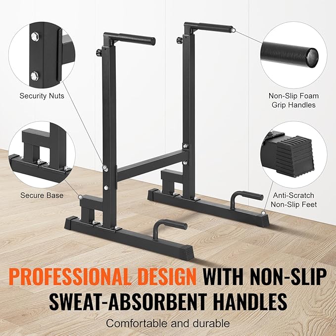 - Comfort & Security Combo: Get ready for a workout experience like no other. Our portable dip bar features foam-padded, non-slip handles that are durable and tear-resistant. Adjusting positions is a cinch, thanks to secure locking nuts. And those non-slip rubber feet keep things quiet and protect your floors – win-win!