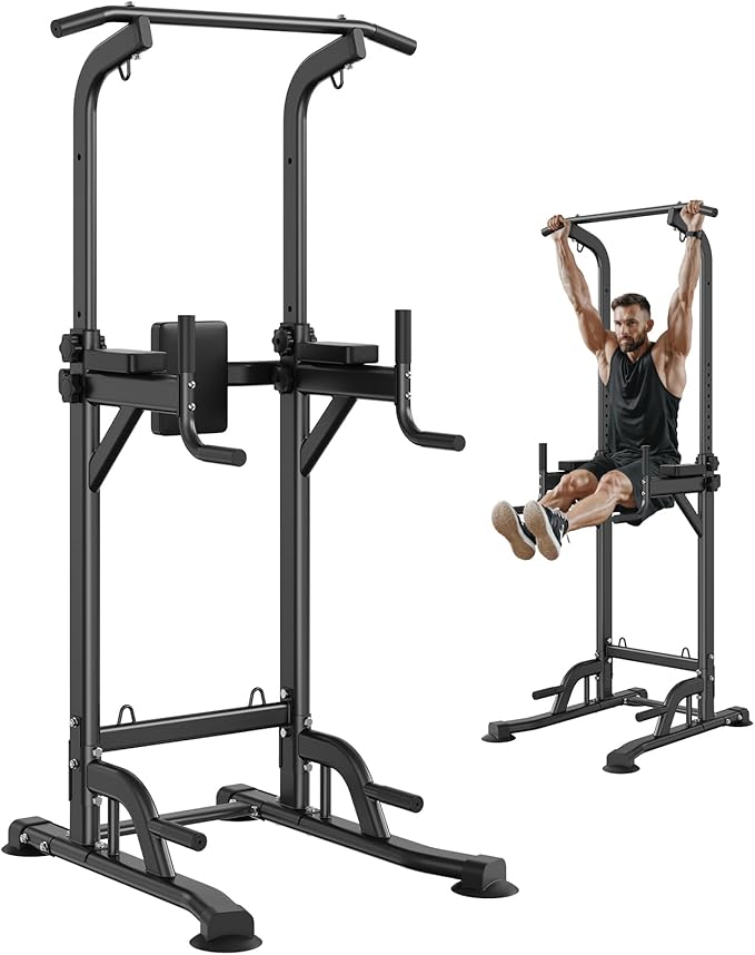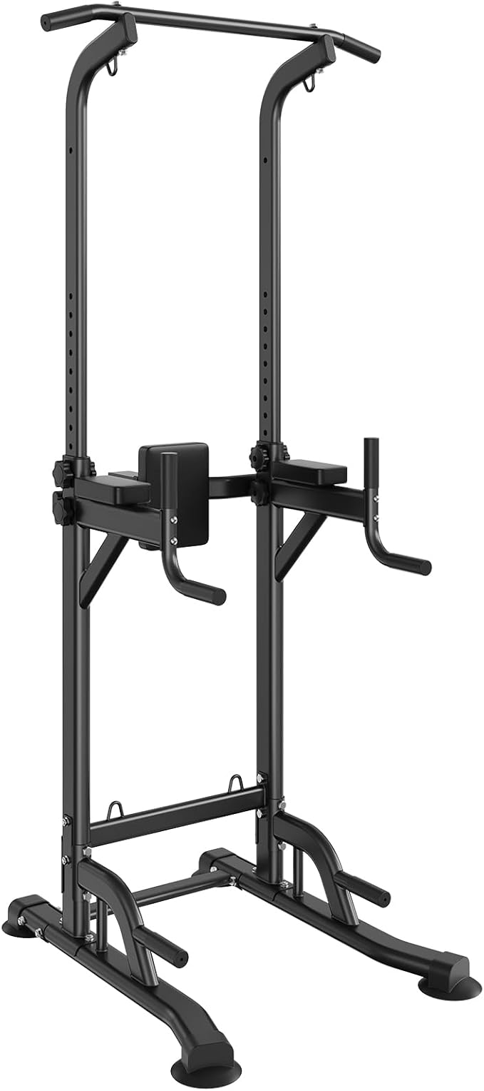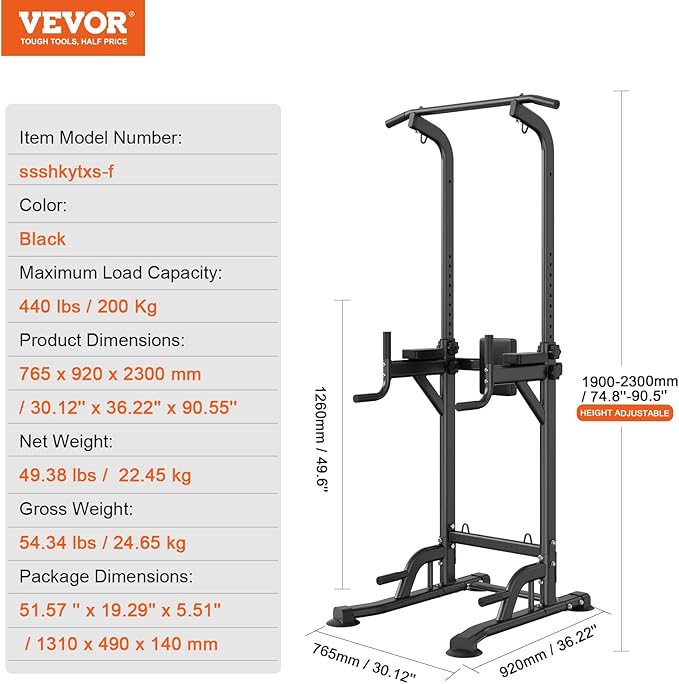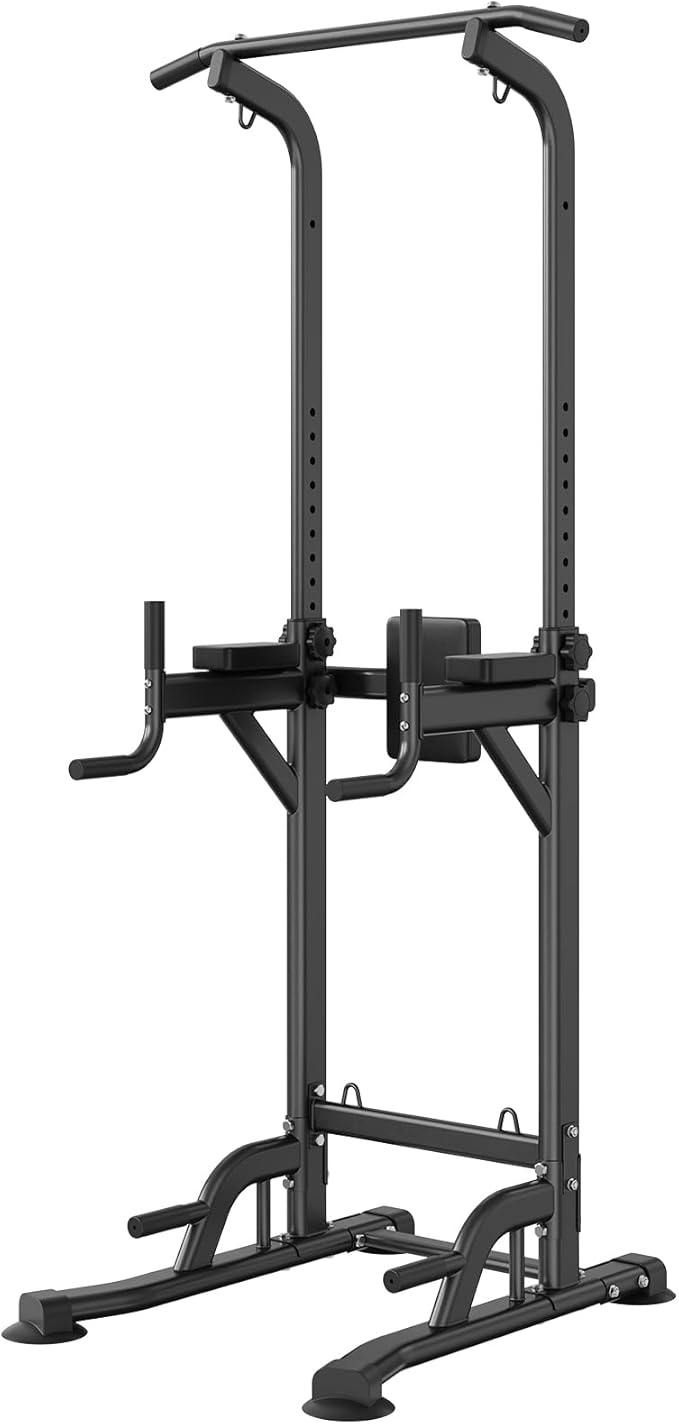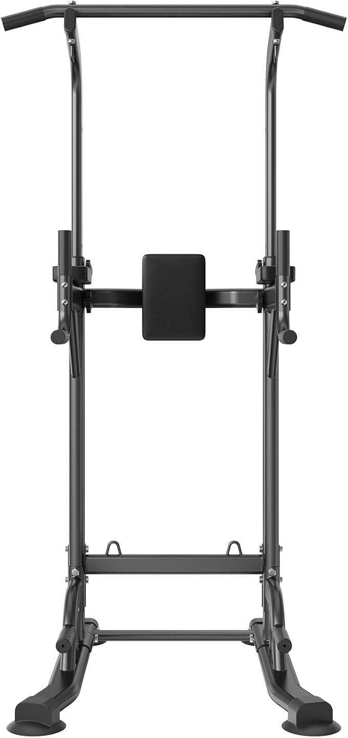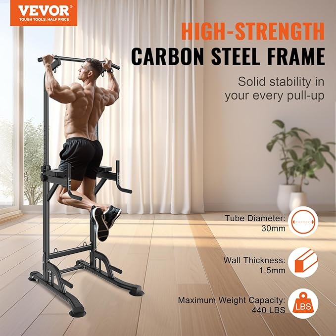 - Solid Construction: Elevate your fitness routine with VEVOR power tower dip station, crafted from rust-resistant carbon steel and treated with surface powder coating for durability. Capable of supporting up to 440LBS, it features 1.5mm wall thickness, H-shaped stable base, and 4 suction foot covers to ensure steady and secure workouts.