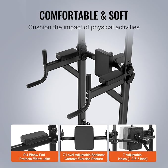 - Ergonomic Power Tower: Prioritizing your comfort and safety, our strength training dip station comes with high-quality PU elbow pads to protect elbow joints. 7-level adjustable premium backrest helps correct exercise posture, stabilize core strength, and protect your spine, ensuring safe and comfortable exercise sessions.