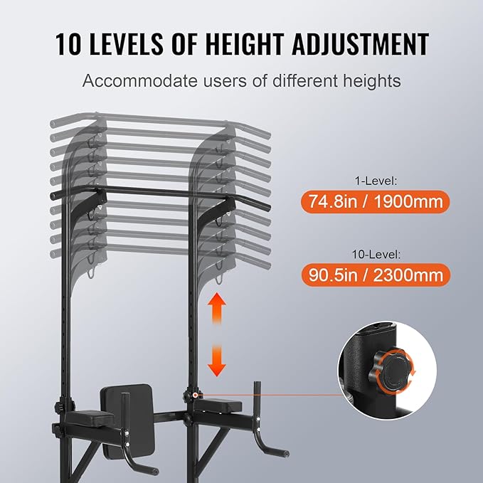 - Easy to Adjust: VEVOR pull up bar stand has 10 levels of adjustment from 74.8-inch to 90.5-inch, accommodating users of different heights and meeting diverse fitness needs. Perfect for adults, teenagers, fitness enthusiasts, and seniors, encouraging family participation in workouts and promoting overall fitness.