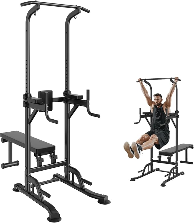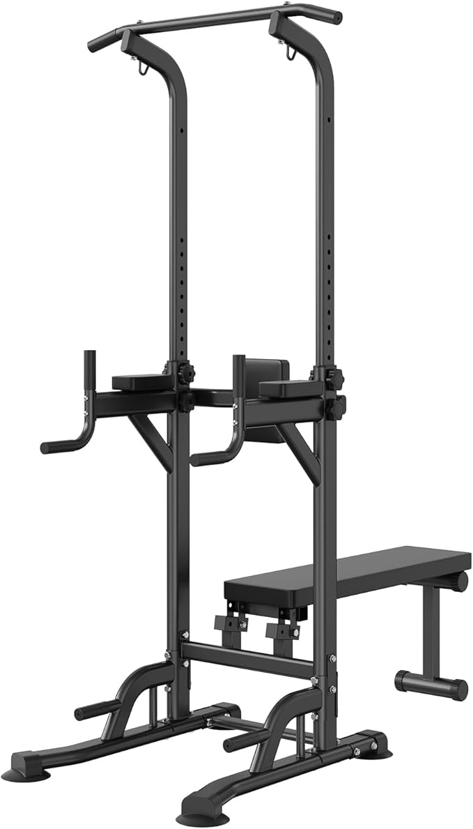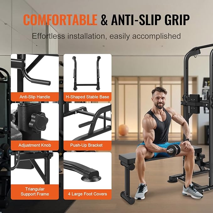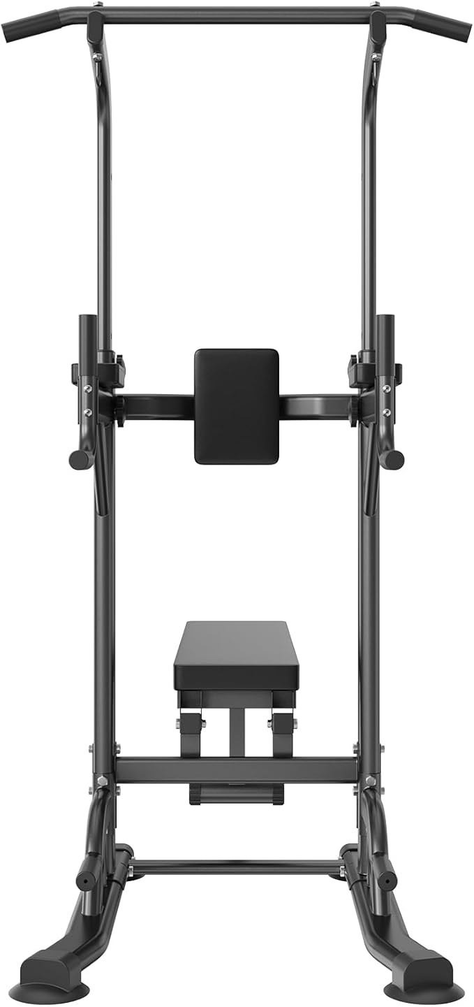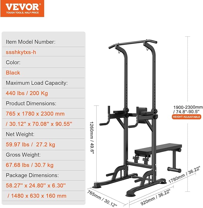 - Solid Construction: Elevate your fitness routine with VEVOR power tower dip station, crafted from rust-resistant carbon steel and treated with surface powder coating for durability. Capable of supporting up to 440LBS, it features 1.5mm wall thickness, H-shaped stable base, and 4 suction foot covers to ensure steady and secure workouts.