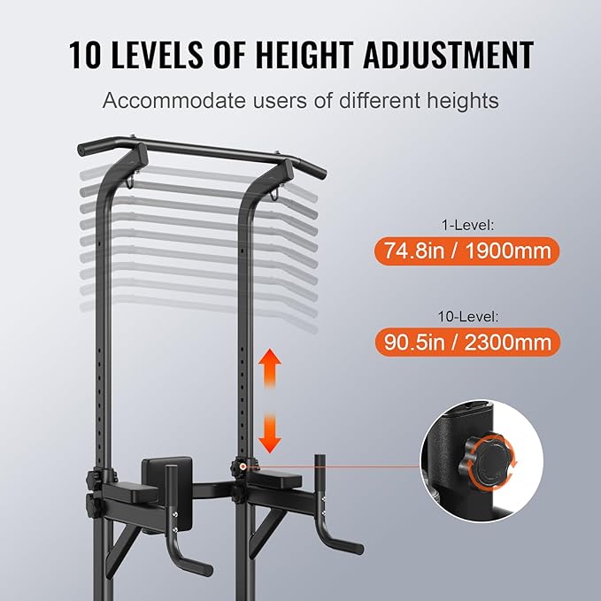 - Easy to Adjust: VEVOR pull up bar stand has 10 levels of adjustment from 74.8-inch to 90.5-inch, accommodating users of different heights and meeting diverse fitness needs. Perfect for adults, teenagers, fitness enthusiasts, and seniors, encouraging family participation in workouts and promoting overall fitness.