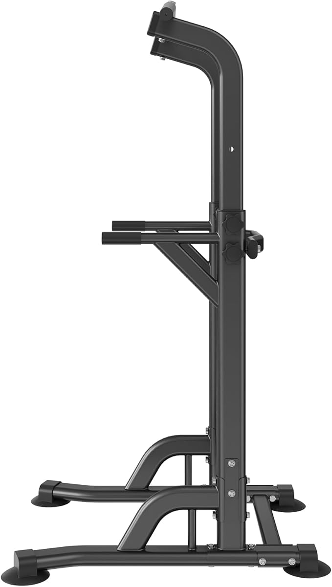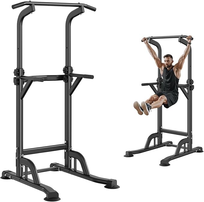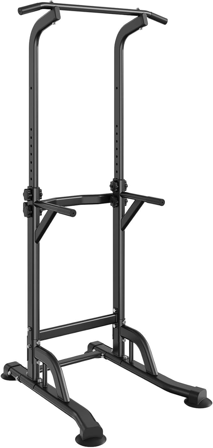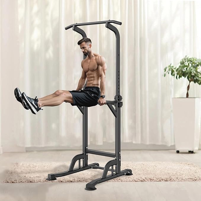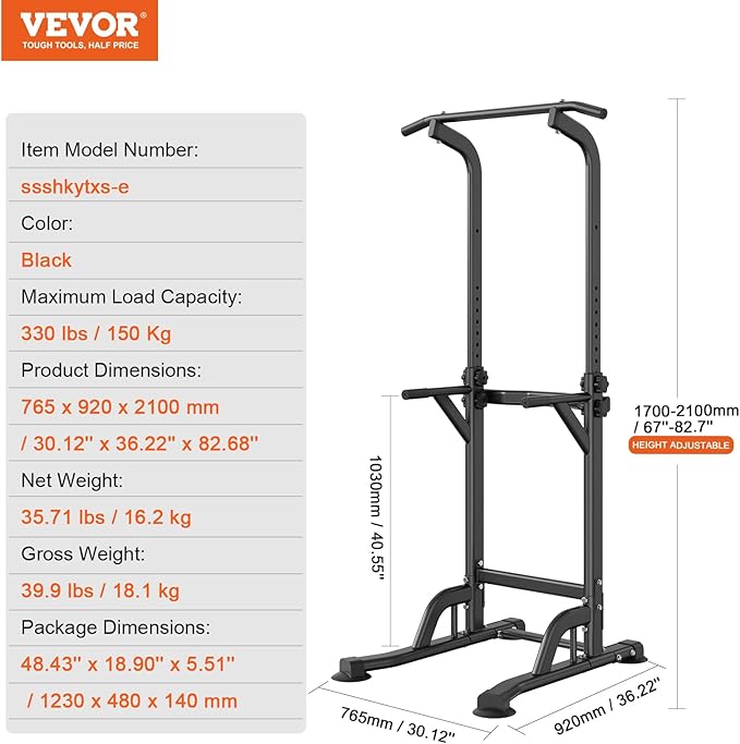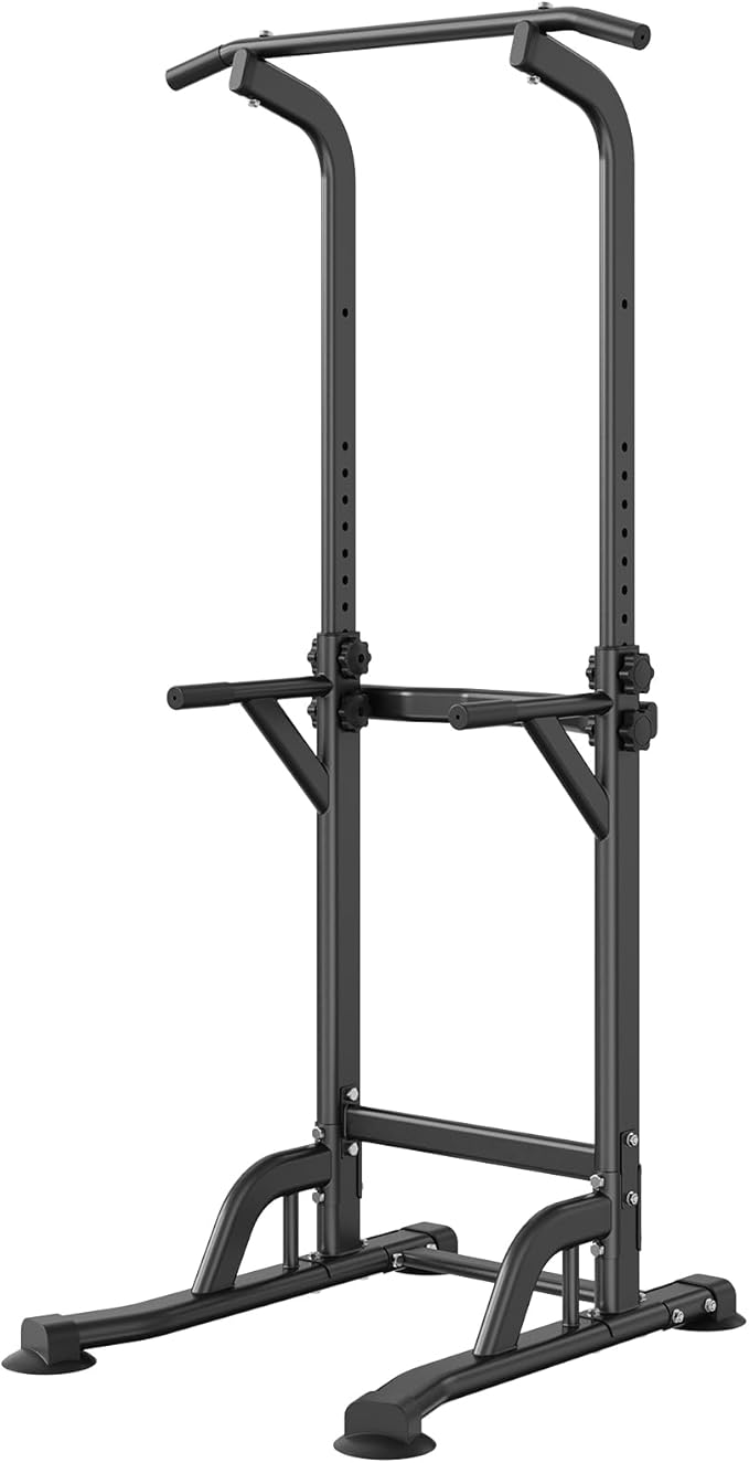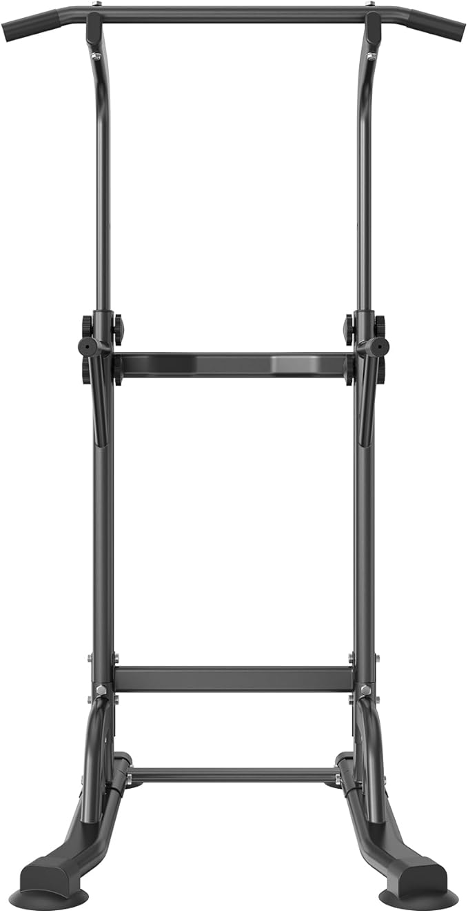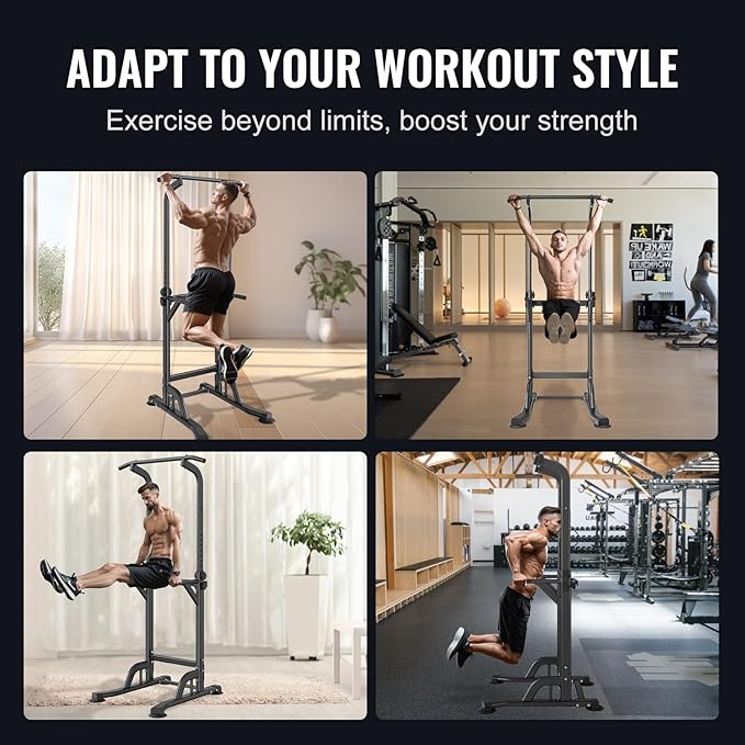 - Solid Construction: Elevate your fitness routine with VEVOR power tower dip station, crafted from rust-resistant carbon steel and treated with surface powder coating for durability. Capable of supporting up to 330LBS, it features 1.2mm wall thickness, H-shaped base, and non-slip feet to ensure steady and secure workouts.