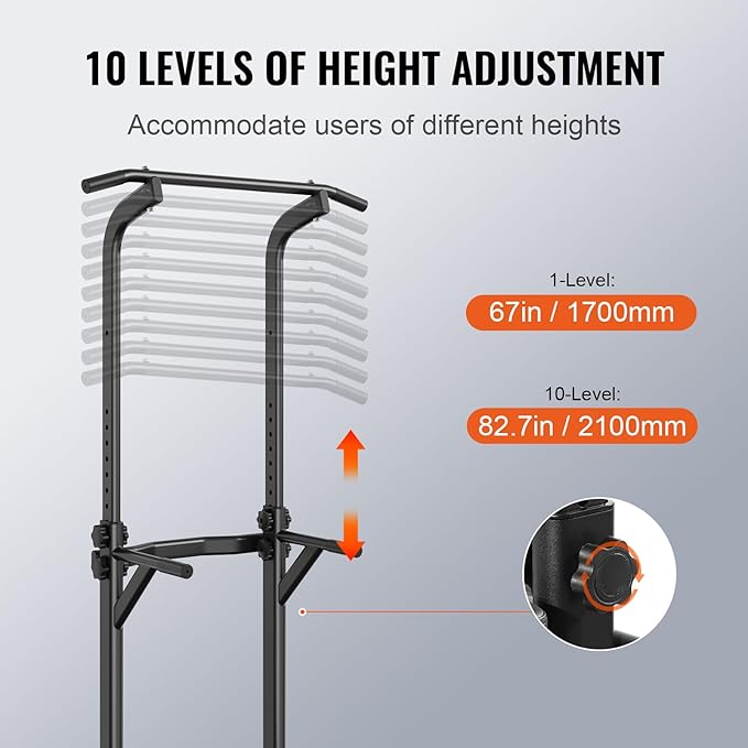 - Easy to Adjust: VEVOR pull up bar stand has 10 levels of adjustment from 67-inch to 82.7-inch, accommodating users of different heights and meeting diverse fitness needs. Perfect for adults, teenagers, fitness enthusiasts, and seniors, encouraging family participation in workouts and promoting overall fitness.