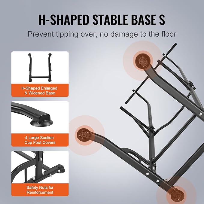 - Double Stability & Security: With H-shaped enlarged base, balanced support, and increased load-bearing area, along with 4 suction foot covers that firmly grip the ground, our strength training dip station ensures stability and prevents tipping without damaging the floor. You can confidently place it on marble, wood, concrete, or carpet.
