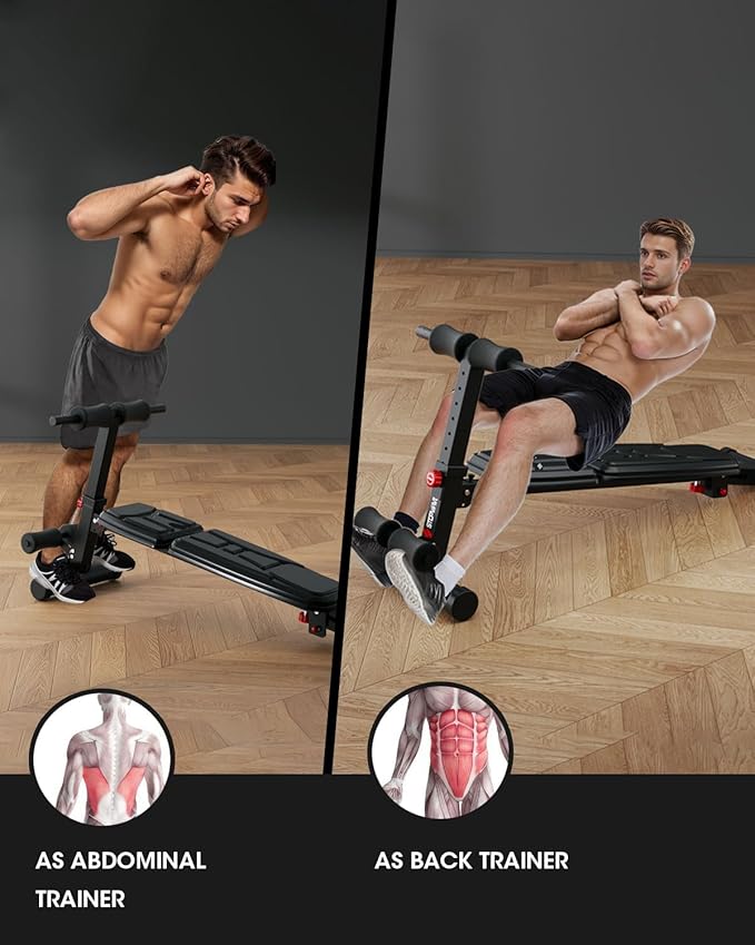 - 【4-in-1 Multi-Functional Bench】4-in-1 weight bench equal to flat bench/sit up bench/roman chair/basic bench; with 3 foot support adjustment, 5 back adjustment and 8 hand bar height adjustments, it supports diverse exercises in incline, decline and flat modes, meeting to a tailored workout experience. Get a weight bench, roman chair, and sit up bench all in one with this single strength training adjustable bench purchase.