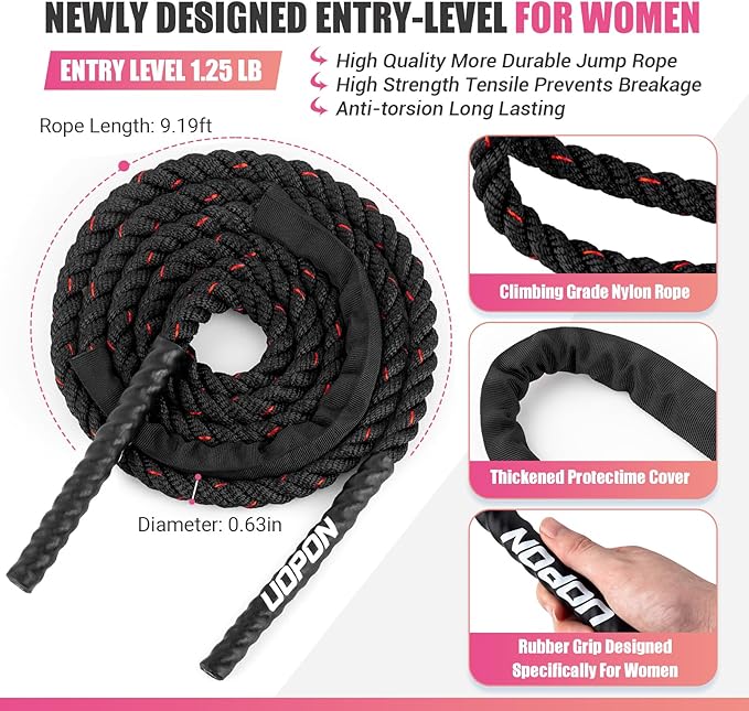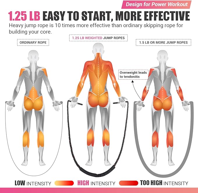 • [WEIGHTED JUMP ROPE DESIGNED FOR WOMEN] Weighted Jump Rope is a great way to get fit, 1.25 lbs Weighted Jump Rope for Beginners is an entry level Weighted Jump Rope for Women, Not too heavy to cause tendonitis. Helps work the entire body and ignites calorie burning with each energizing jump, building endurance and promoting weight loss.
