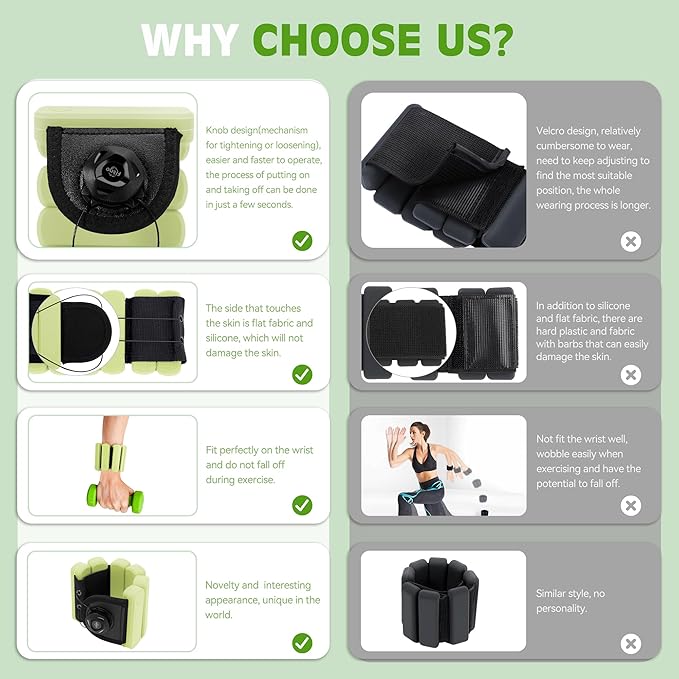 - NOVEL and PRACTICAL DESIGN -- Combined with the innovative knob design, overcome the defects of similar products(designed with Velcro) and make one-handed operation more convenient. Unique knob operation structure (rotate right to keep tightening until it fits your wrist; just rotate it once to the left to pull it open and take it off) to help you put on the sports weight bracelet quickly and accurately, and fit your wrist better without falling off when wearing.