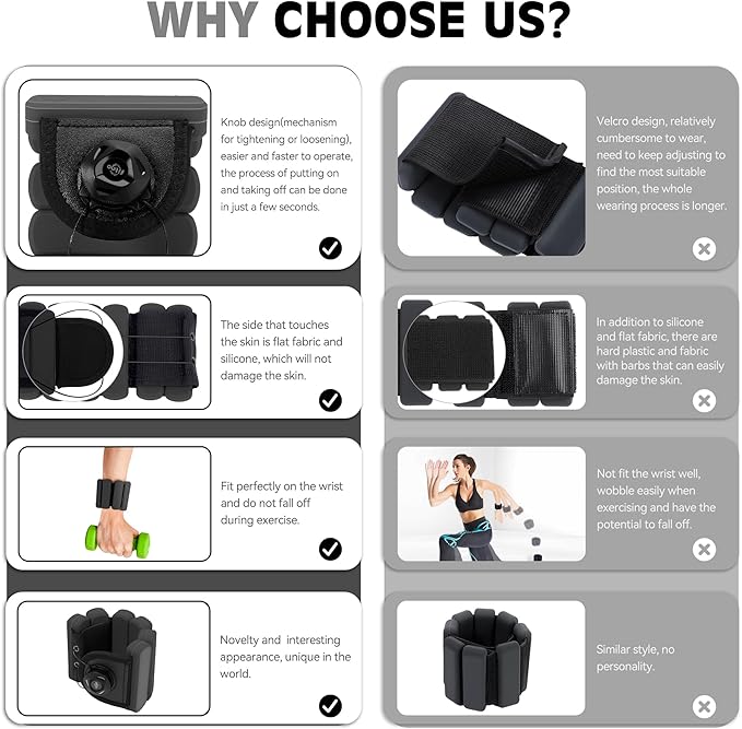 - NOVEL and PRACTICAL DESIGN --Combined with the innovative knob design, overcome the defects of similar products(designed with Velcro) and make one-handed operation more convenient. Unique knob operation structure (rotate right to keep tightening until it fits your wrist; just rotate it once to the left to pull it open and take it off) to help you put on the sports weight bracelet quickly and accurately, and fit your wrist better without falling off when wearing.