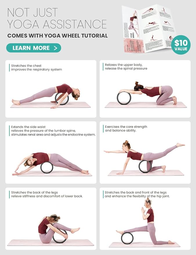 - 【Yoga Equipment】 3 size of yoga wheels with 1 yoga strap, 1 resistance band, 2 fitness posters. Multiple combinations of products can significantly improve the effectiveness and efficiency of your exercise, which supports you to challenge higher level of yoga poses.